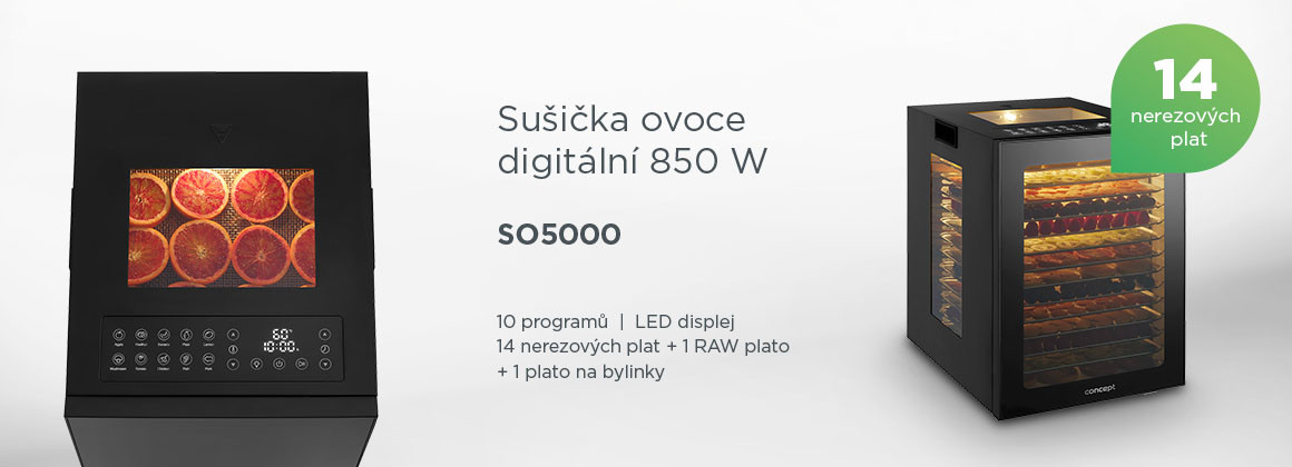 Sušička ovoce Concept SO5000 s příkonem 850 W si efektivně a rychle poradí i s velkým množstvím surovin, které můžete sušit na 14 nerezových platech. Hlavní výhodou nerezových plat je jejich vysoká trvanlivost, odolnost proti bakteriím, plísním a jiným mikroorganismům a snadná údržba. Současně urychlují proces sušení, protože se během provozu nahřívají. Díky horizontálnímu proudění vzduchu sušička garantuje rovnoměrné sušení ve všech patrech. Vnitřní osvětlení a výsuvný systém usnadňují vaši kontrolu.