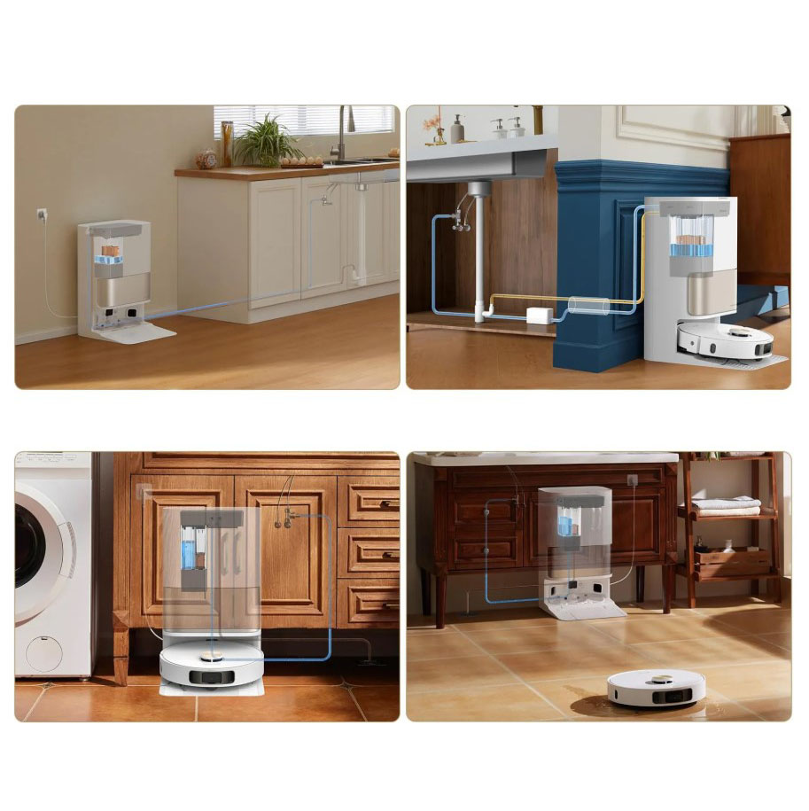 Sada pro připojení vody pro automatické doplňování a vypouštění. Umožňuje snadnou instalaci a zajišťuje spolehlivý a rovnoměrný přívod vody, který optimalizuje výsledky čištění a použití robotického vysavače.