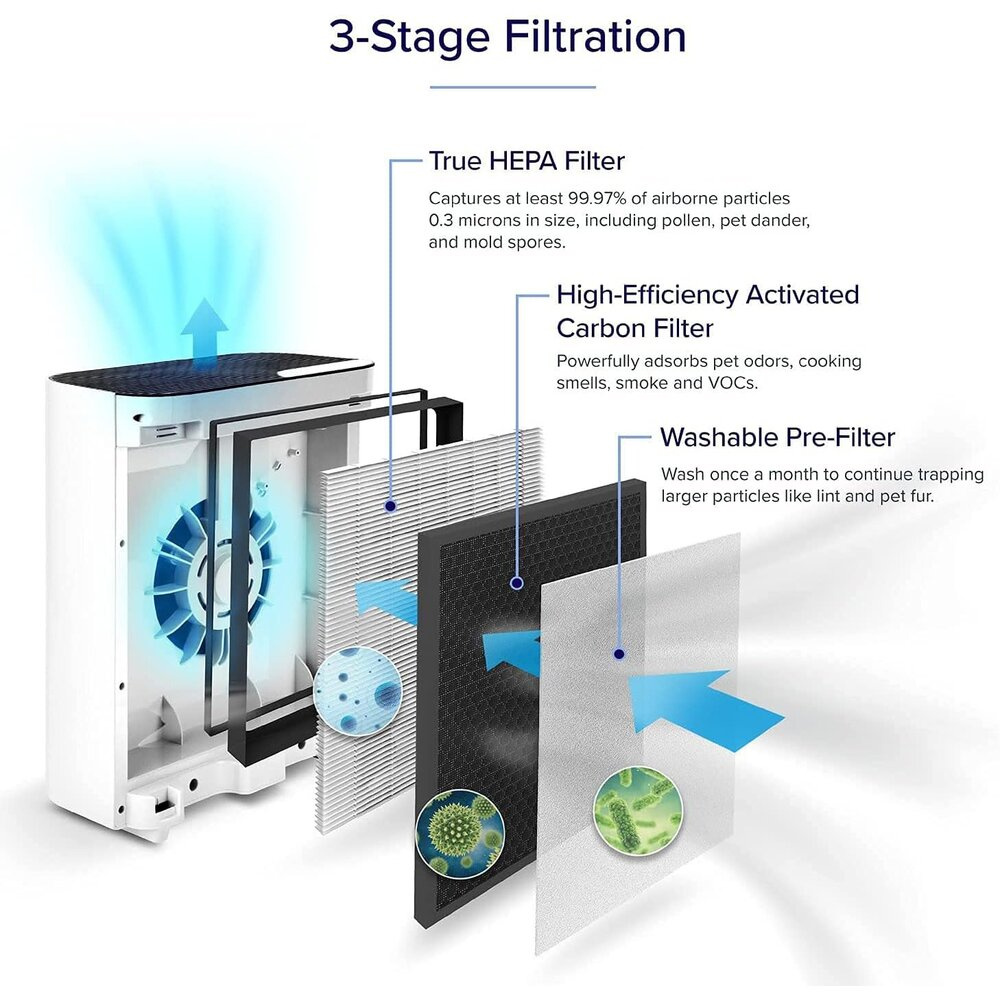 Druhou vrstvou je HEPA filtr. Vylepšený staticky nabitými vlákny, která zachytí nejméně 99,97 % částic přenášených vzduchem o velikosti 0,3 mikronu, jako je jemný prach, částice kouře, plíseň, bakterie, pyl, kouřové částice, roztoče, a zvířecí srst. To odlišuje Levoit od konkurence, protože HEPA filtry jsou mnohem kvalitnější a spolehlivější než běžně používané filtry.