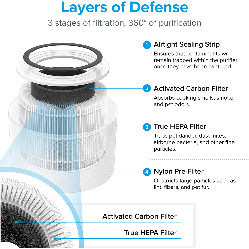 Čištění vzduchu probíhá ve třech vrstvách začínající nylonovým vnějším filtrem zachycujícím nejhrubší částice jako prach, vlákna či chlupy. Druhou vrstvou je HEPA filtr s ARC™ formula odfiltrující jemné prachové částice, plíseň, bakterie, pyl, kouřové částice, roztoče a srst. Poslední karbonový filtr odstraňuje kouř, pachy a výpary. Systém zachytí až 99,97% všech nečistot až do velikosti 0,1 mikronů a je certifikován pro alergiky a astmatiky.