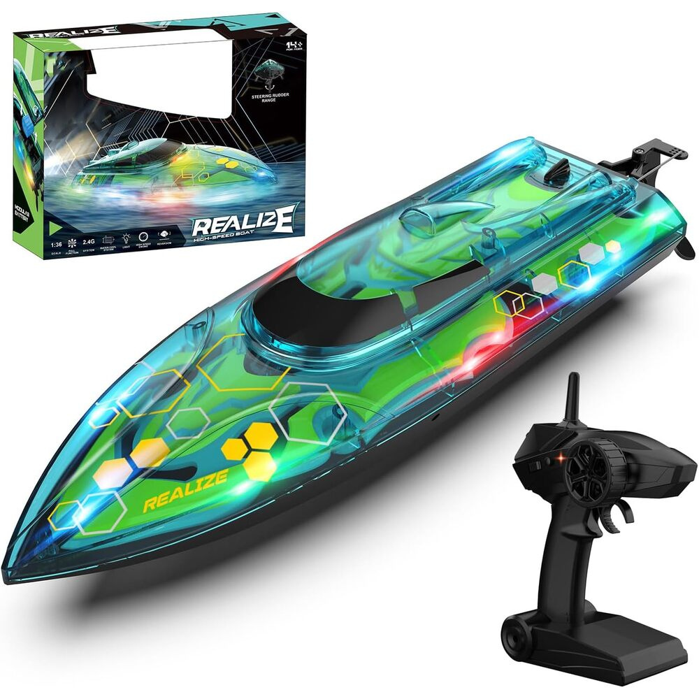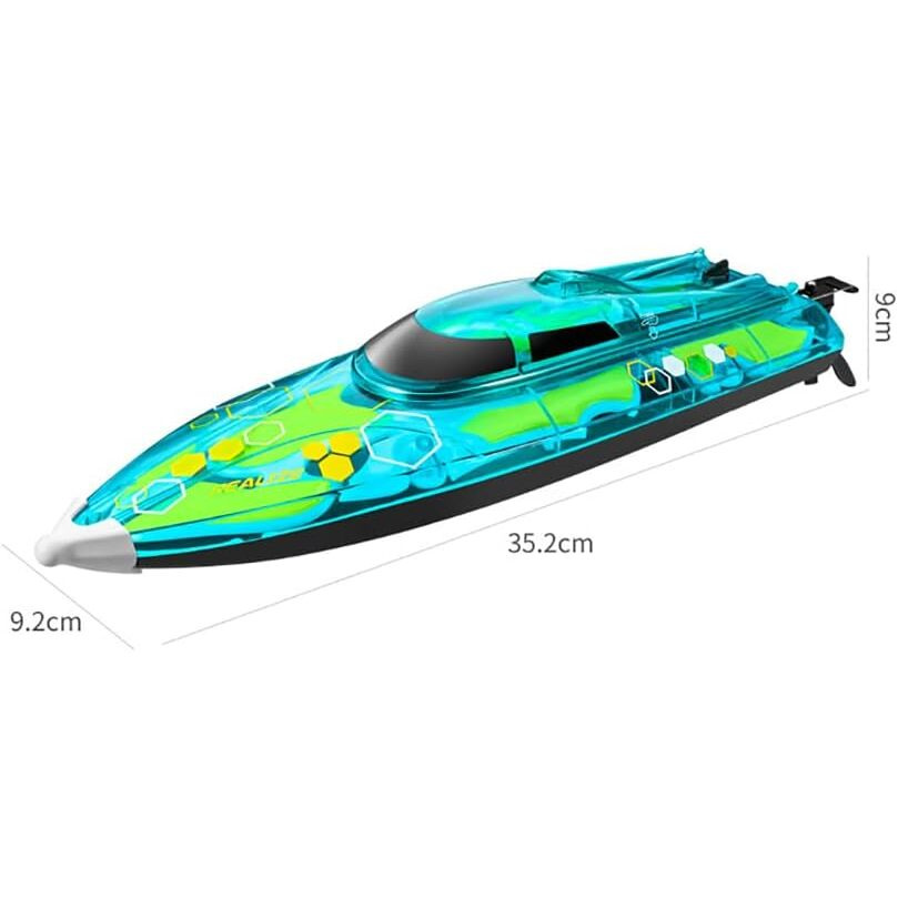 Dálkově ovládaný závodní člun Ssccgym h155 představuje zelený speedboat s plnotělovým LED osvětlením, který dokáže dosáhnout rychlosti 20-28 km/h na hladině. Model je určen pro nadšence ve věku od 14 let a nabízí precizní ovládání prostřednictvím 4CH 2.4G systému s dosiahem až 150 metrů. Plavidlo v rozměrech 35,2 x 9,2 x 9 cm disponuje vodotěsným trupem z ABS plastu odolného nárazům s anti-tilt modulárním designem, který zajišťuje stabilitu i při vyšších rychlostech. Ovládání pistolového typu umožňuje pohyb vpřed, vzad, doleva, doprava včetně 180° přesného otáčení, přičemž inteligentní systém automaticky odešle alarm při překročení vzdálenosti nebo nízké baterii. Energii dodává lithiová baterie 7.4V 600mAh s výdrží 20 minut plavby a dobou nabíjení 180 minut pomocí přiloženého USB kabelu s ochranou. Vestavěný vodní chladicí systém chrání motor před přehřátím během závodění. V balení najdete člun s ovladačem, nabíjecí kabel, náhradní vrtuli o průměru 2,9 cm, stojan a návod. Ovladač vyžaduje 2x AA baterie 1.5V, které nejsou součástí dodávky. Tento model v měřítku 1:28 představuje ideální volbu pro jezera, rybníky i bazény.