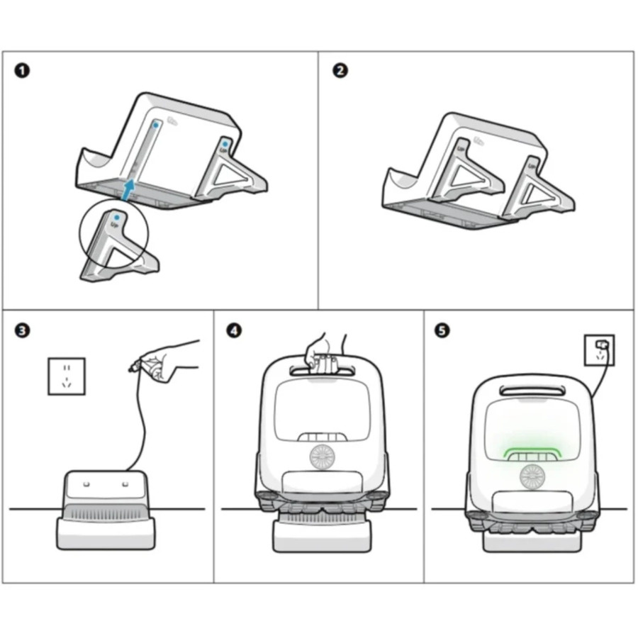 Jeho svislá poloha usnadňuje manipulaci, zatímco kompaktní design šetří místo a udržuje prostor bazénu uklizený. Zároveň chrání robota, když se nepoužívá. Instalace je rychlá a snadná, bez použití nářadí a složitého nastavení.