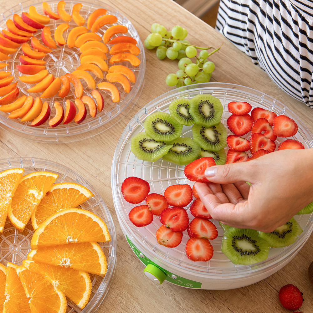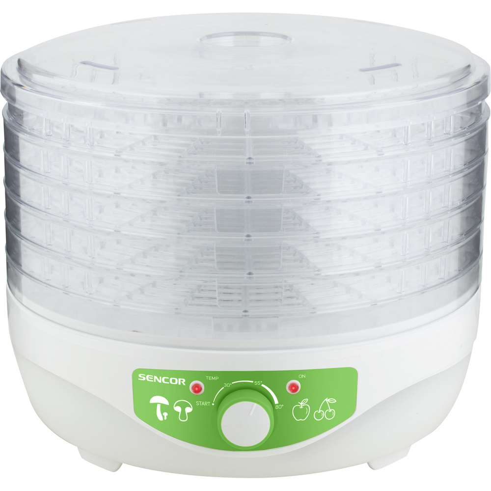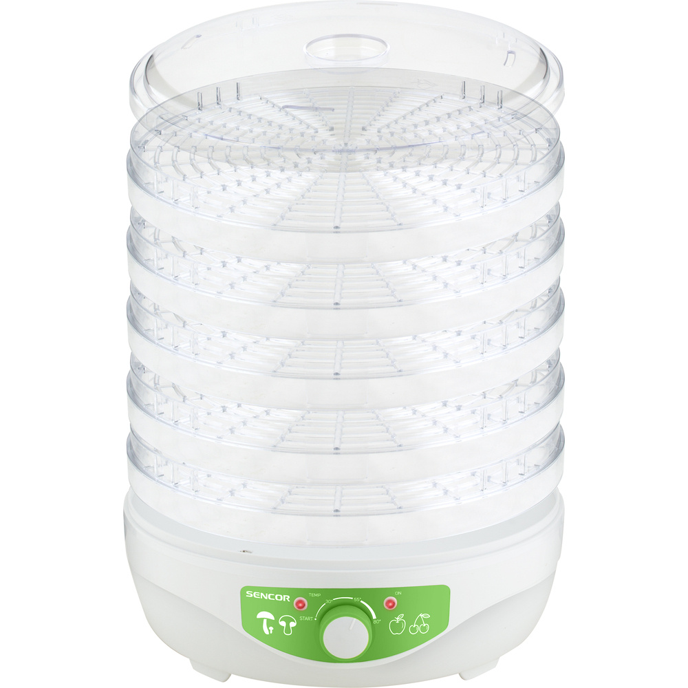 Model SENCOR SFD 790WH nabízí pět praktických plat s průměrem 23 cm a nastavitelnou výškou 1,3 cm. Integrovaný ventilátor zajišťuje optimální cirkulaci horkého vzduchu do všech pater, zatímco speciální mřížková konstrukce plat zabraňuje vzniku plísní a optimalizuje proudění vzduchu. Sušičku lze používat již od jednoho plata, což oceníte při zpracování menšího množství surovin.