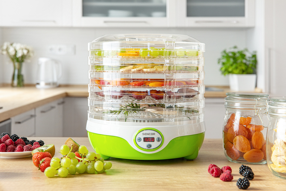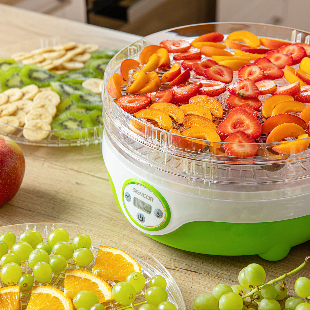 Sušička je vybavena podsvíceným LED displejem a elektronickou regulací teploty v rozsahu 35-70 °C. Zvládne širokou škálu potravin od ovoce a zeleniny přes houby a bylinky až po přípravu sušeného masa. Je vhodná i pro výrobu domácích sušenek, placek nebo přípravu RAW potravin, přičemž zachovává maximum vitamínů a minerálů bez přidaných konzervantů.