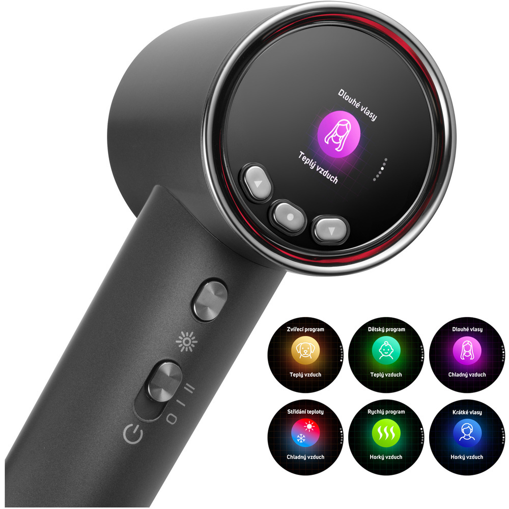 Vysoušeč nabízí 5 specializovaných režimů: rychlý program pro časově náročné ráno, střídání teploty pro šetrné sušení, speciální nastavení pro dlouhé i krátké vlasy. Oceníte také dětský program bezpečný pro použití od osmi let a zvířecí program vhodný pro domácí mazlíčky. Studený proud vzduchu pomáhá s fixací a zpevněním účesu.