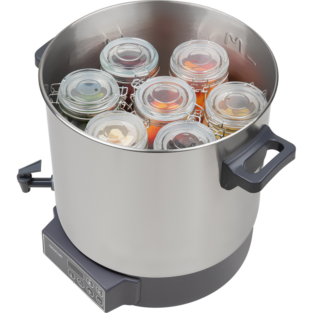 SPP 3200SS se uplatní nejen při zavařování, ale slouží také jako všestranná várnice pro přípravu různých pokrmů. S vysokým příkonem 1800 W zvládne přípravu kávy, čajů, omáček, polévek, svařáku či moštu. Vestavěný výpustní kohout umožňuje pohodlné stáčení připravených nápojů, zatímco po sejmutí víka s praktickým úchopem lze servírovat i hutná jídla. Pokročilé digitální ovládání nabízí dva režimy provozu - časovaný s nastavením až na 12 hodin a režim nepřetržitého udržování zvolené teploty. Přehledný displej zobrazuje veškerá aktuální nastavení pro maximální kontrolu nad přípravou.