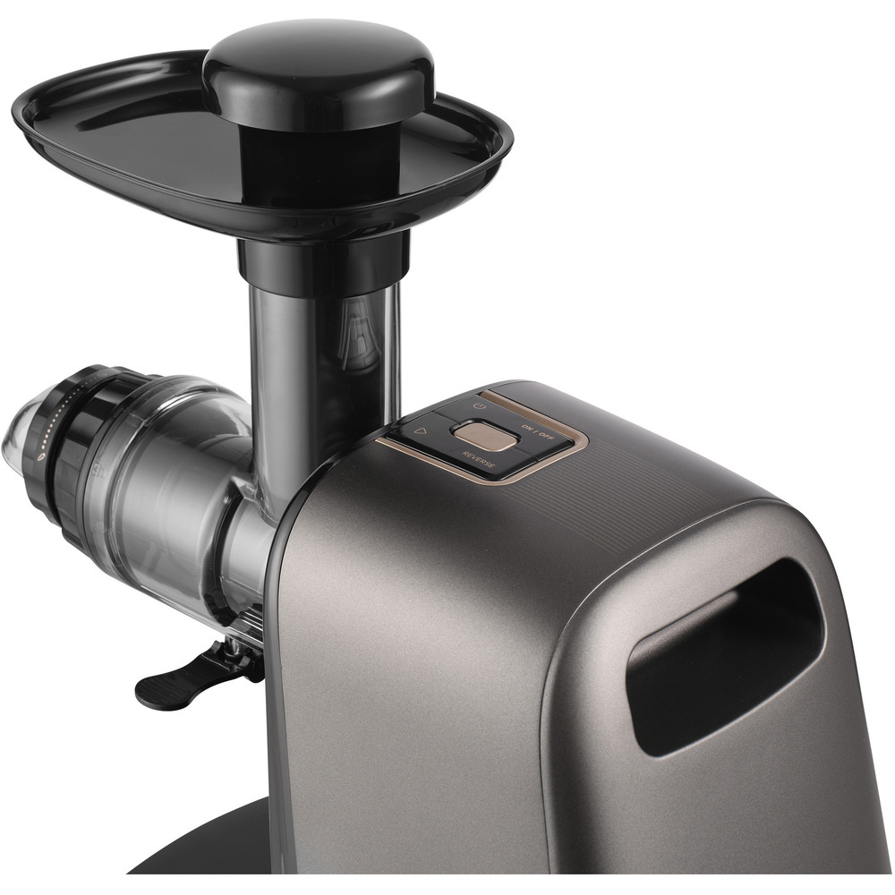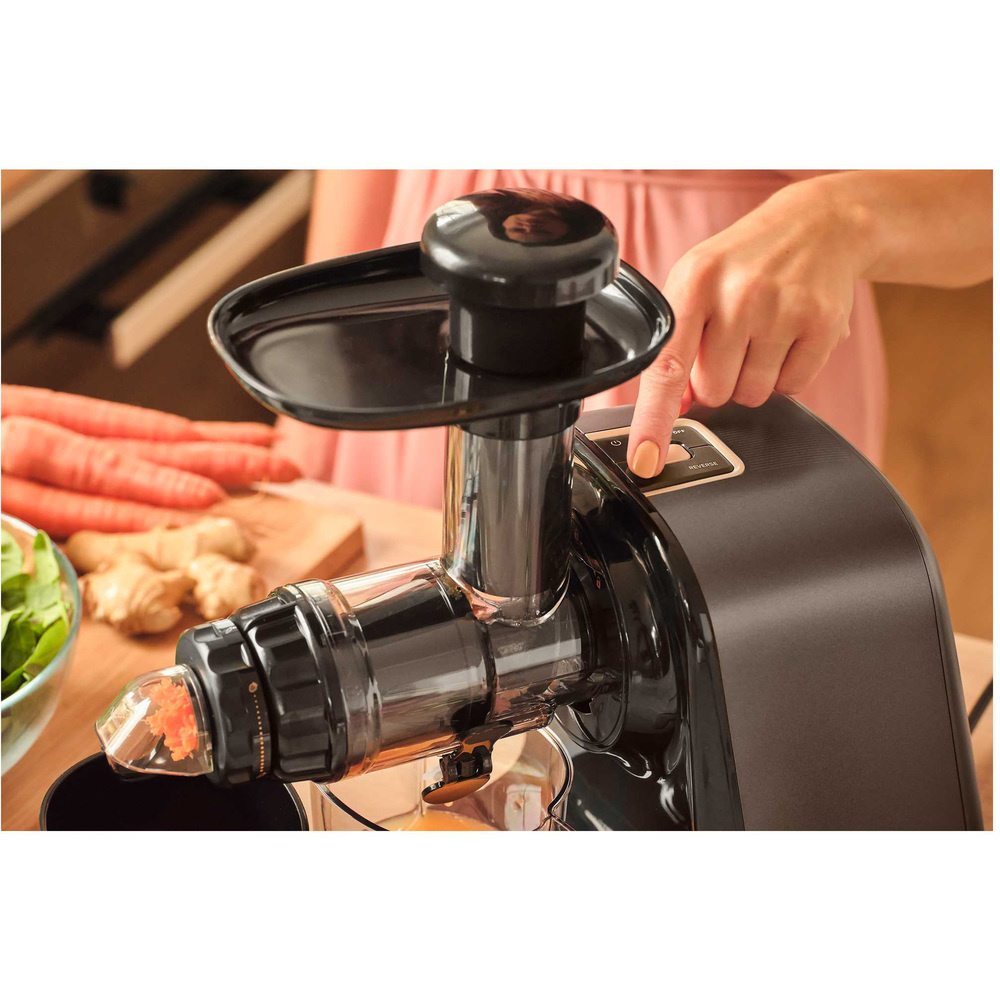 Odolný odšťavňovací šnek poháněný výkonným 150W DC motorem s mimořádně tichým během snadno zpracovává i nejtvrdší suroviny. Model SSJ 0900BK patří mezi nejtišší odšťavňovače ve své kategorii. Praktické tlačítko REV přepíná motor do zpětného chodu, čímž rychle uvolní případně zaseknuté ingredience a zajistí nepřetržitý komfort obsluhy.