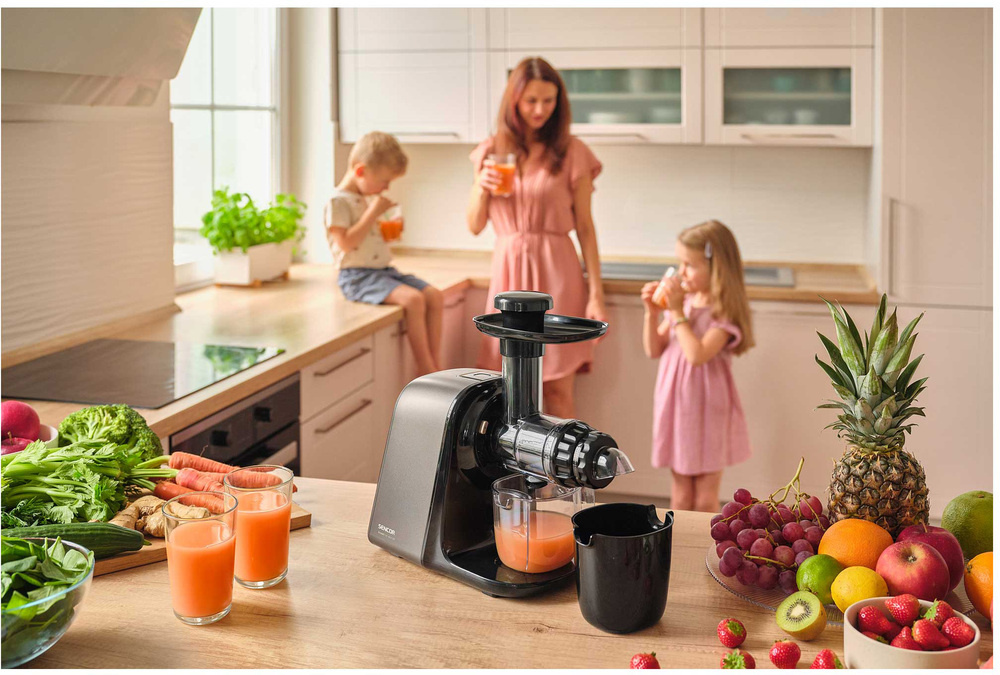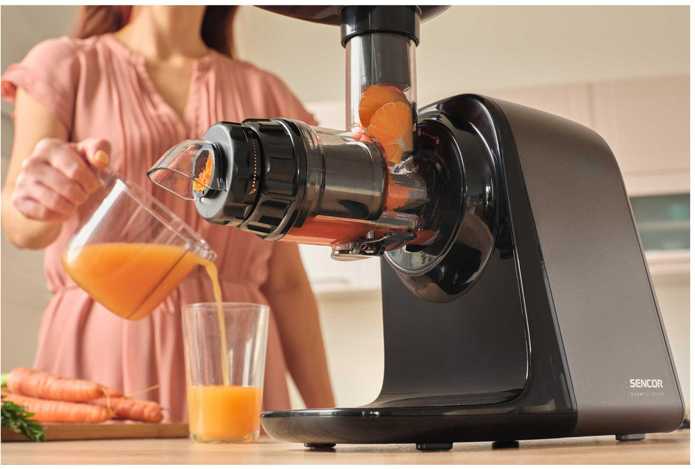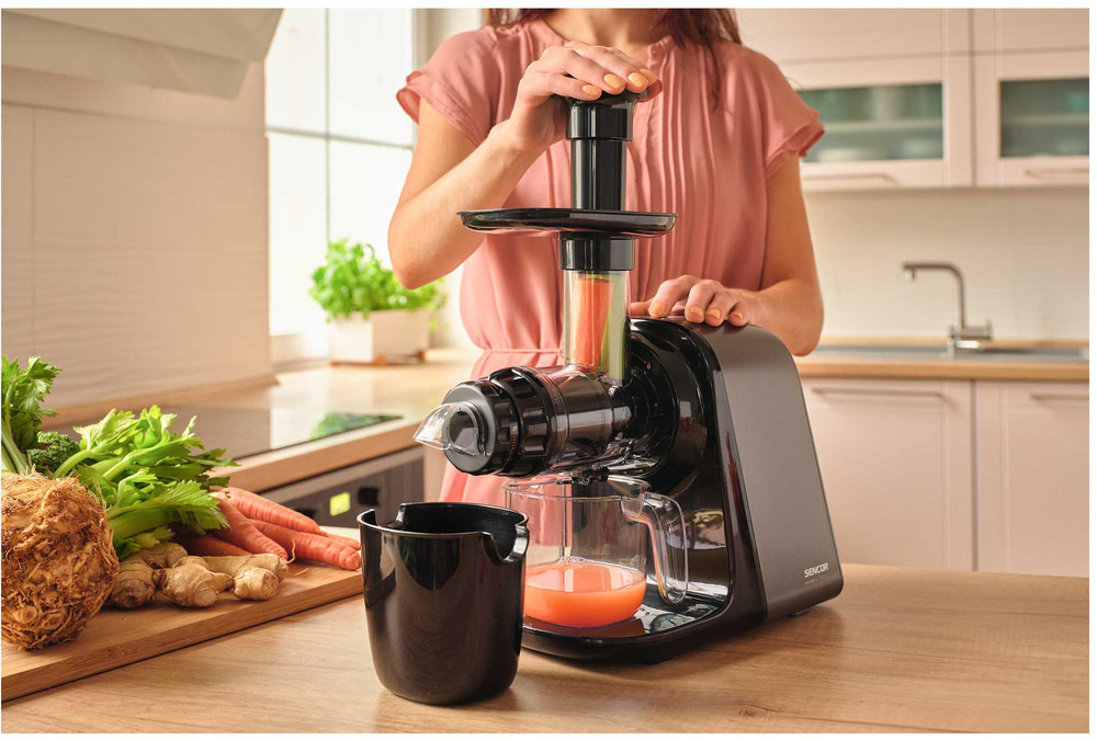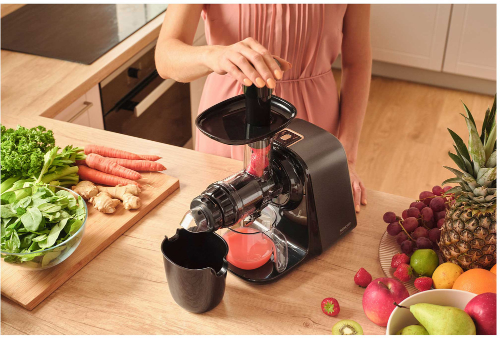Šnekový odšťavňovač SSJ 0900BK disponuje revolučním nízkootáčkovým mechanismem pracujícím při pouhých 65-80 otáčkách za minutu. Tato technologie zajišťuje šetrné zpracování jablek, citrusů, exotických plodů, rybízu, mrkve i listové zeleniny. Díky preciznímu lisování získáte ze surovin čerstvou šťávu plnou vitamínů s minimálním obsahem pěny a maximální chutí.