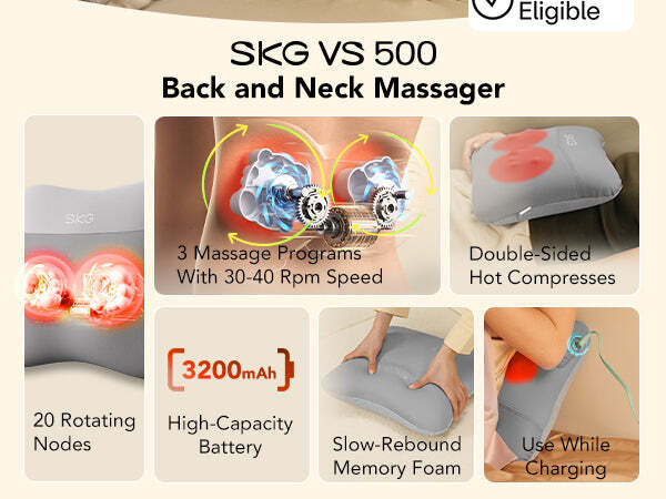 Vychutnejte si profesionální masážní zážitek doma nebo na cestách s přístrojem SKG VS500. Tento přístroj disponuje 20 dynamickými masážními uzly, které replikují ruce profesionálního maséra prostřednictvím hnětací technologie a reverzního tlaku. Společně s dvoustrannou tepelnou terapií uvolňují ztuhlé svaly, snižují únavu a zlepšují krevní oběh. 360° ergonomický design zajišťuje pohodlné používání na klíčových oblastech těla jako krk, ramena, bedra a stehna – ať už ležíte v posteli nebo sedíte v kancelářské židli. 3 rychlostní stupně vám umožňují přizpůsobit intenzitu masáže vašim potřebám – ať už dáváte přednost jemné relaxaci nebo hlubšímu uvolnění svalového napětí.