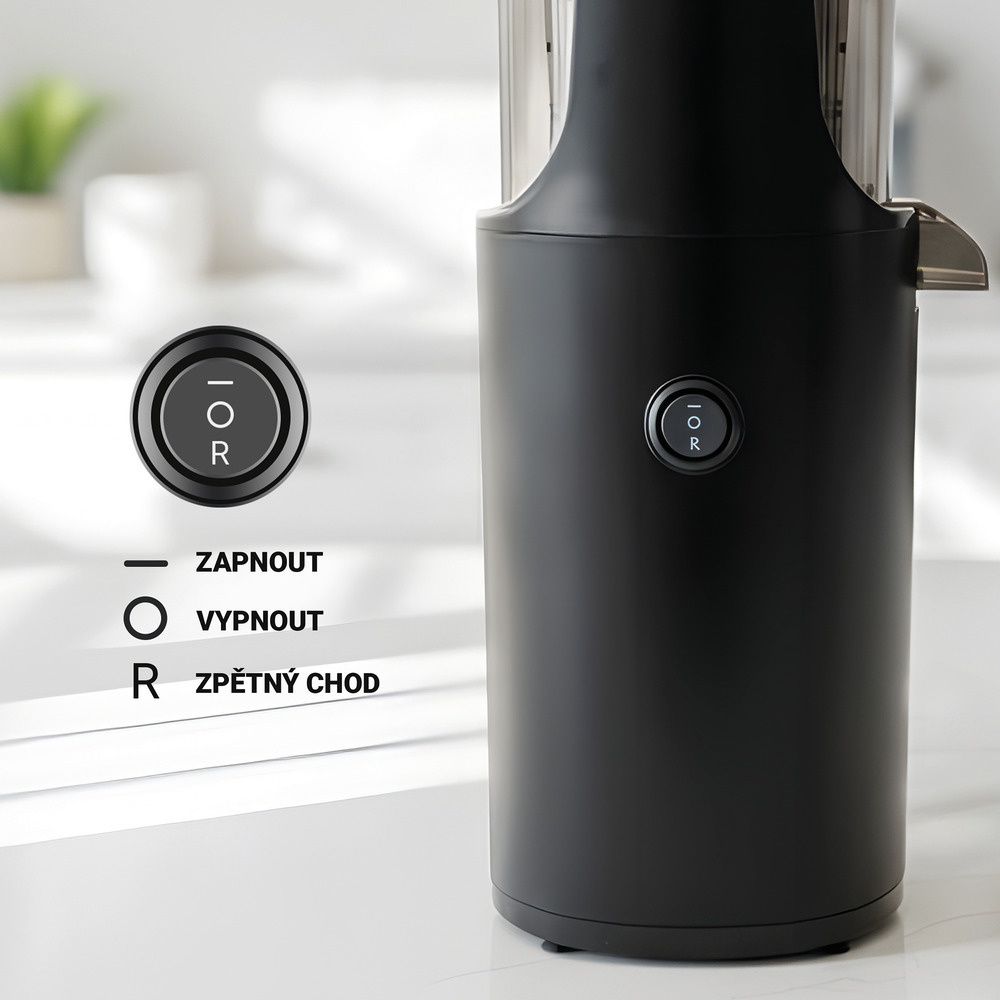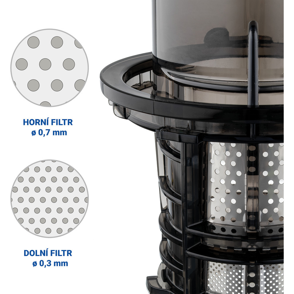 Přístroj je osazen spolehlivým motorem s příkonem 200 W a robustním lisovacím šnekem z vysoce odolného plastu, který si bez obtíží poradí i s tvrdšími surovinami. Jemný dvouvrstvý mikrofiltr zajišťuje důkladné oddělení dužiny a vytváří hladkou, jemnou šťávu s plnou a přirozenou chutí, vhodnou pro každodenní konzumaci.